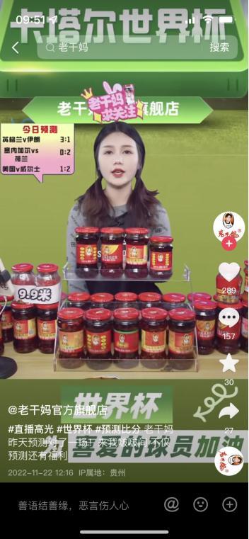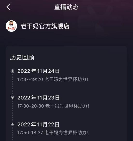 目前,老干妈官方旗舰店最新一条抖音仍停留在2022年11月22日,内容是借预测世界杯比分热度宣传直播间。该账号曾于2022年11月22日-11月24日,连续三天进行三场主题为“老干妈为世界杯助力”的直播,之后一直未有更新。而在此之前几个月,该账号几乎每天都有直播。