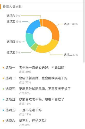 一份由新浪科技发起,520人参与的投票显示,有57%的消费者还在继续购买老干妈,其中27%的人也会尝试老干妈以外的新品牌;有40%的人不再购买老干妈,其中有15%的人群以前喜欢老干妈而如今不喜欢了。至少可以说明的是,老干妈仍有一批“死忠粉”,但也有不少顾客“变了心”,老干妈不再像曾经一样是唯一的选择。