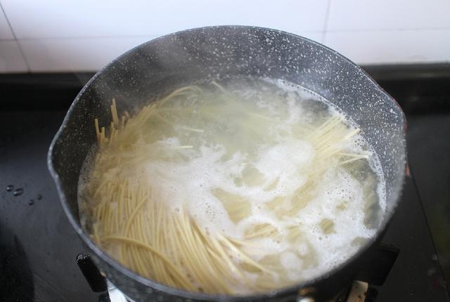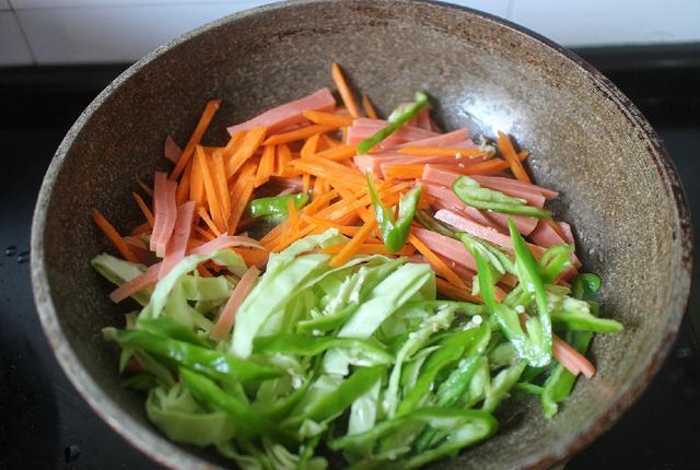 材料:胡萝卜半根、圆白菜少许、方腿半根、青辣椒3个、碱面两人份、盐适量、生抽一小勺、老抽一勺、胡椒粉少许1、锅内倒入半锅水,烧热后将面条下锅,然后再往锅内加入少量的盐和油,这样做也是为了防粘,很多人没有注意到这一点,所以啊,第一步就做错了,难怪会粘锅!另外面条煮到9分熟即可出锅