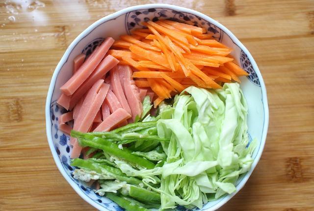 2、煮面的时候,我们将炒面要用到的菜类都切成细条状,放在碗内备用!其实菜可以选择自己喜欢吃的,不用完全按照食谱来