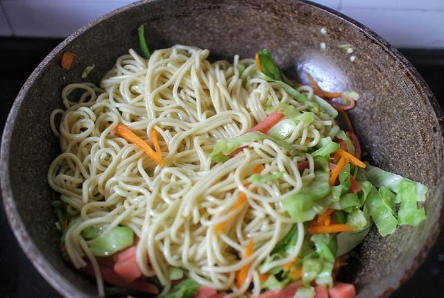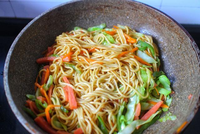 中国地大物博,主食除了大米之外,面条也是我们日常中的主食之一,说到面条,它已有四千多年的制作食用历史。可以说相当悠久了,面条其实是一种用谷物或豆类的面粉加水磨成面团,之后擀制成片再切或压,或者使用搓、拉、捏等手段,制成条状,面条的形状也有多种,或窄或宽,或扁或圆,或小片状,面条虽为主食之一,但是在南方吃的相对较少,北方人多以面食为日常主食。面条除了形状各一之外,它的烹饪食用方法也有多种,有炒的、煮的、干拌的和焖的等等,要问我最爱吃哪一种做法,那肯定非炒面莫属,我虽为南方人,但是打小就爱吃炒面,炒面的时候,放点蔬菜火腿搭配着炒来吃,别提多香了,可以说它是一种简单的美味。即使让我每天吃,也不会吃腻!