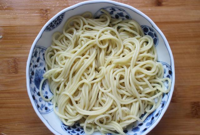 3、煮熟的面条捞出控干水,放进凉水里泡一会,捞出沥干水备用