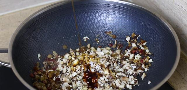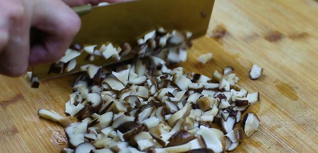 再准备一点新鲜的香菇用水煮熟,砍成这样的碎末。