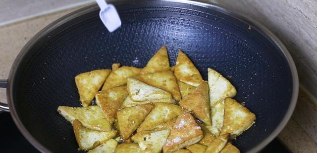 然后净锅上火,先把豆腐在锅中煎至两边金黄,可能会有很多人说自己在家里面煎的豆腐,永远都不黄,有两个原因,可能是你买的豆腐质量不是很好,还有就是你没有用菜油煎,如果用菜油煎出来的东西,一般情况下都是比较金黄的,煎香之后在表面撒一点盐,再撒一点孜然粉,就像烧烤店一样,必须要是把豆腐煎香之后才可以放孜然粉。