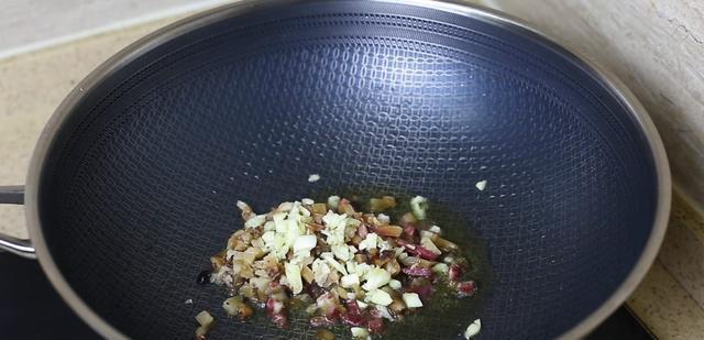 另取一个干净锅,先放入蒜末和香肠,或者是腊肉丁,一起煸炒出香味。