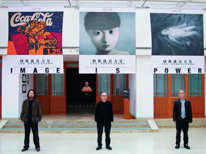 2002年,深圳何香凝美术馆“图像就是力量”开幕式现场(左起:王广义、张晓刚、方力钧)