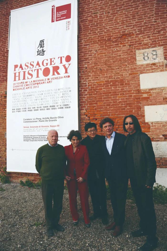 2013年5月29日,参加“历史之路”开幕式现场发言的吕澎、奥利瓦、威尼斯副市长、王广义、保罗在展厅外面的海报前合影