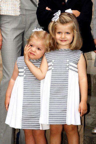 莱昂诺尔一身红白相间的连衣服非常抢眼,旁边妹妹的奶油色连衣裙则更柔和清新。