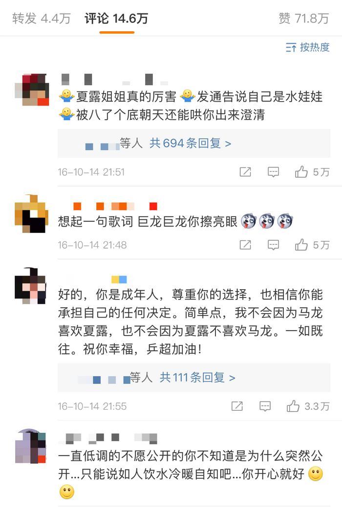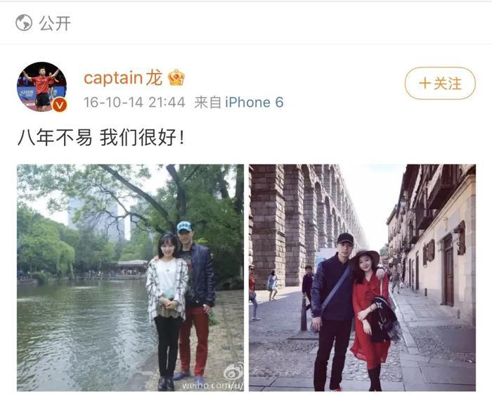 2016年10月,马龙发了微博官宣恋情。