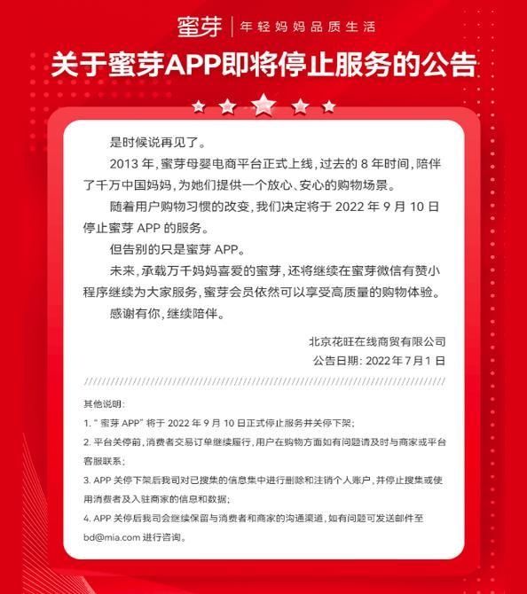近日,蜜芽的运营主体北京花旺在线商贸有限公司发布公告称,蜜芽APP将于2022年9月10日停止服务,微信有赞小程序将继续提供服务,会员也依然可以享受购物体验。在平台关停前,消费者交易订单继续履行。目前,苹果和安卓的应用商店均已无法下载该软件。