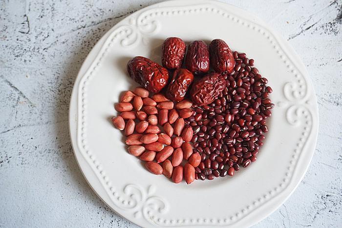 食材:红枣,红皮花生,红豆,冰糖,水。