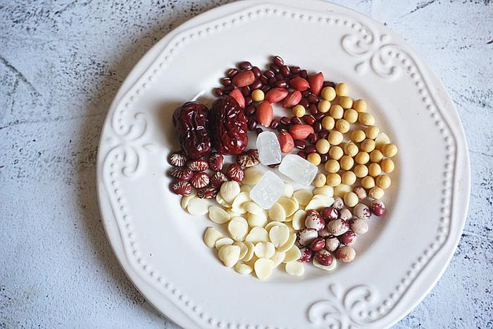 食材:红枣,红豆,红皮花生,黄豆,肾豆,熊猫豆,杏仁,冰糖,水。