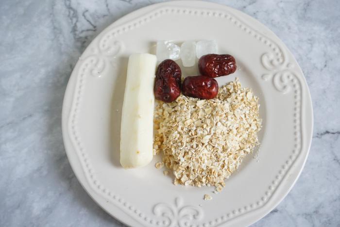 食材:铁棍山药,麦片,红枣,牛奶,冰糖。