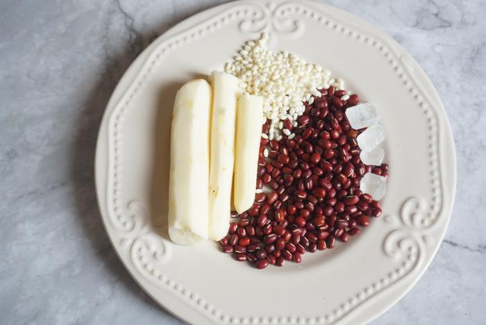 食材:红豆,铁棍山药,糯米,冰糖,牛奶。