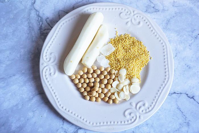 食材:铁棍山药,小米,黄豆,杏仁,冰糖,水。