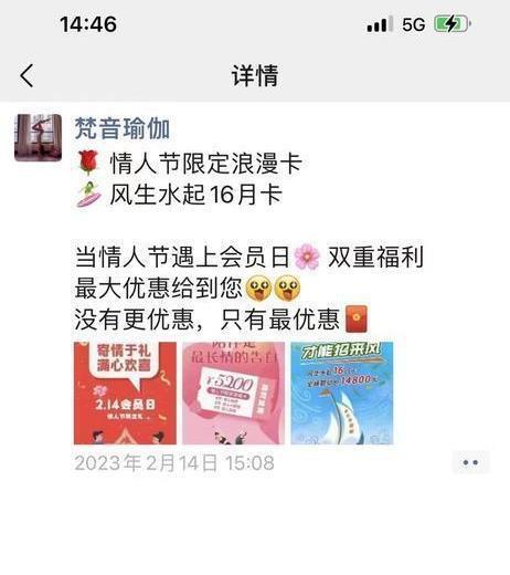 据会员投诉,广州梵音瑜伽在关店前十几天,还举办了大型“情人节”促销活动。记者在梵音课程顾问的朋友圈里仍可以看到2月14日的活动信息。“我刚买会员不到一个月。”会员“小紫”说,她花了12199元购买课程,一共22个课时,平均课时费达500多元。“目前,我只上了7节课。”小紫说。