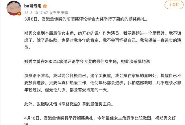 在香港金像奖的前哨评论学会大奖中,郑秀文拿到了最佳女主角奖。