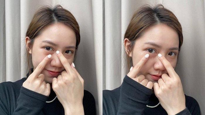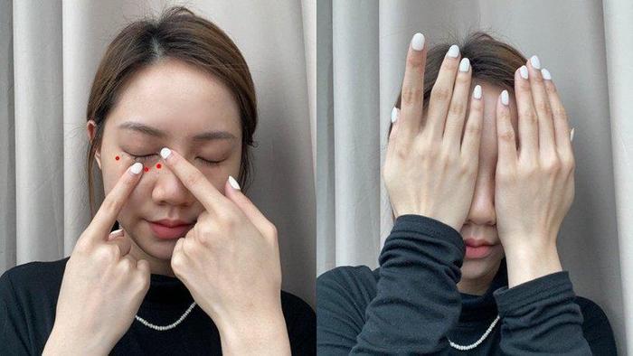 一样用指腹,从内眼角到外眼角的方向,用“点、压”的方式按摩一下眼皮,大约按摩2~3次,眼霜就被吸收得差不多了。最后将双手手心搓热并覆盖在双眼上,让手上的温度帮助保养吸收,就完成了超简易的眼周保养了。