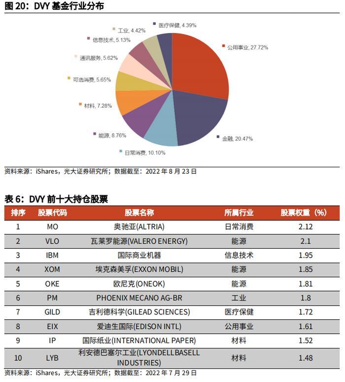而采用“高股息”策略的红利基金DVY,从行业分布看,都是传统成熟行业,公用事业、金融、日常消费是前3大重仓行业。