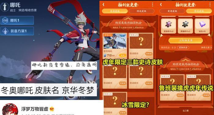众所周知,每次新皮肤推出的时候,都有会概率免费获得抽奖活动,此次新春之际上线的皮肤也不例外,从此次的免费活动中,在史诗皮肤一栏中,就有五个位置,包括了已经上线的韩信傲雪梅枪,以及三款虎年史诗皮肤。