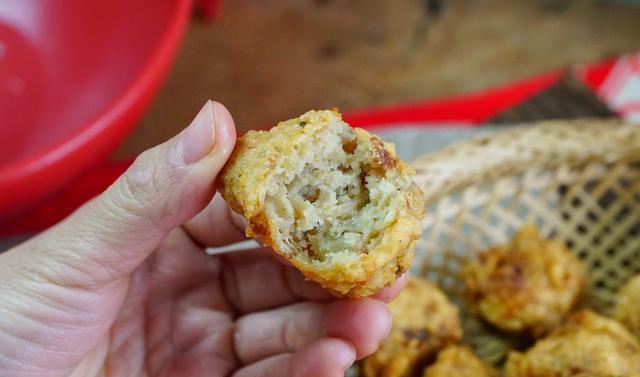 5、锅中加入适量的油,油温5成热,手中捏团馅料,用虎口挤出一个丸子状,下锅炸至表面微黄后,气泡基本消失后捞出控油。