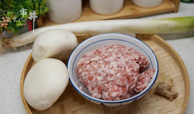 1、肉馅倒入大碗中,馒头撕掉表皮,搓成馒头碎,大葱拍扁后切段,使其味道能更充分地释放出来,姜清洗干净后去皮,一部分切片,另一部分切末。