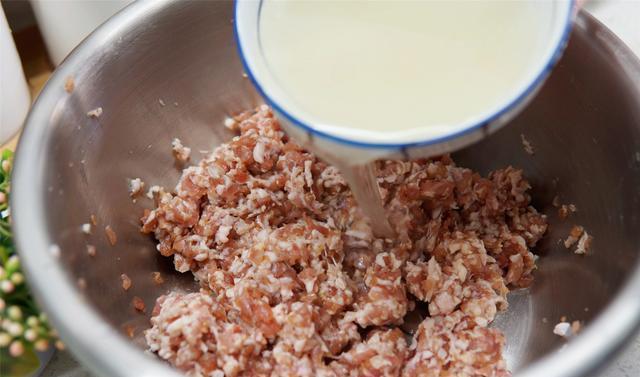 3、肉馅中根据个人口味,加入五香粉、盐、胡椒粉、生抽和姜末调味,搅拌均匀后,葱姜花椒水倒入肉馅中,料水要分为3次或者4次倒入,每次加入葱姜花椒水都要充分搅拌肉馅,使肉馅吸收足够的水分后,打入一个鸡蛋继续搅拌至上劲。
