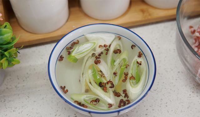小贴士:最好选用肥瘦相间的猪肉,不要用纯瘦肉的,不香。通常冬天炸丸子时肉馅的肥瘦比例为3:7,夏天肉馅肥瘦比例则可调整为2:8,也可以根据自己的喜好来调整肥瘦比例。2、制作料水,碗中加入葱段、姜片和花椒,加入温水浸泡10分钟后,用滤网将葱、姜和花椒捞出,留料水。