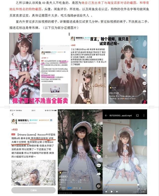 2019年,随着夫人不吃鱼的洛丽塔换装视频在短视频平台的爆火,夫人不吃鱼也成为了洛丽塔圈内炙手可热的“网红”,不少品牌找到她进行产品推广。好景不长,夫人不吃鱼在某二手网站上出售裙子的事件被网友曝出,其中夫人不吃鱼将一件拍过开箱视频的洛丽塔裙子标注“全新仅试穿”进行转手。除此之外,让网友集体炸锅的,是她同时出售了一双袜子,同样是试穿过便进行了二次销售。