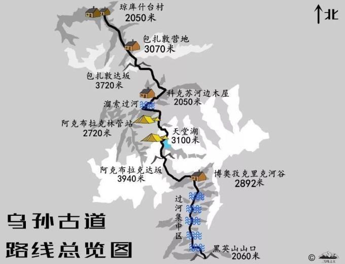 而中线才是正牌的乌孙古道,全程约110公里左右:琼库什台村—琼达坂—科克苏河—天堂湖—阿克布拉克达坂—黑英山山口,大致需要走6天。