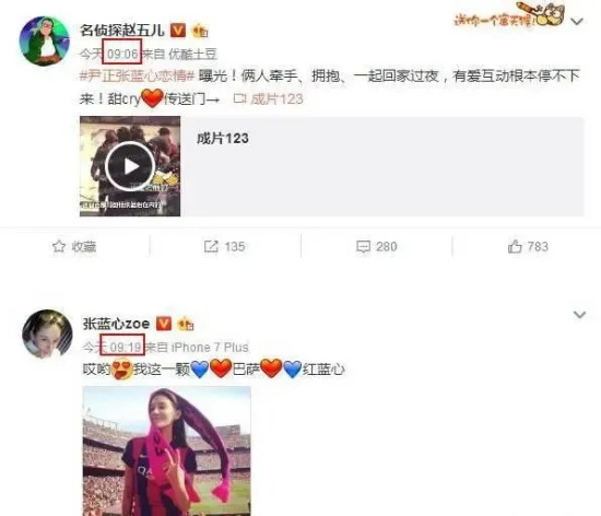 张蓝心对恋情也是毫无反应,只发了庆祝巴萨赢球的微博。