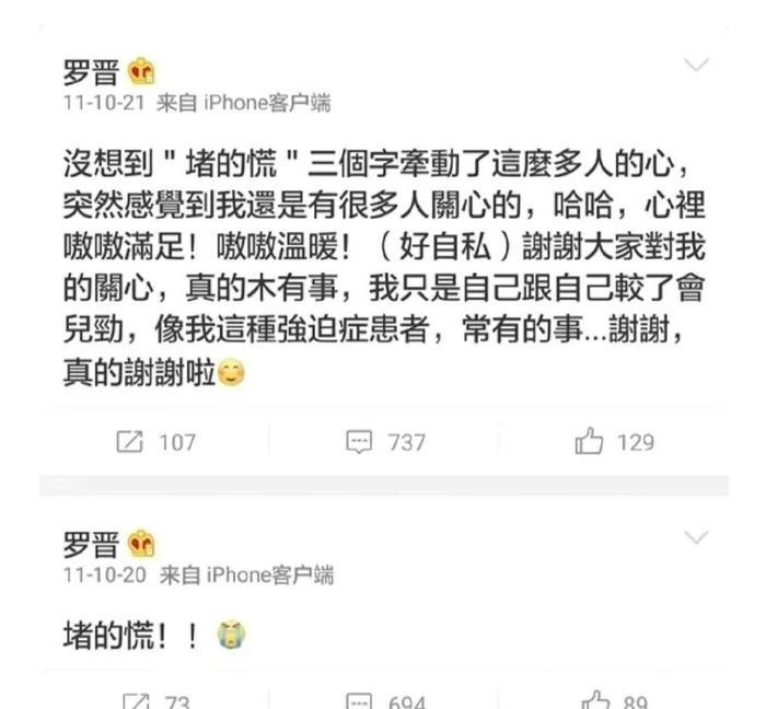 那段时间,罗晋总是在微博发一些很emo的文字,像什么堵得慌,软肋啊之类的。
