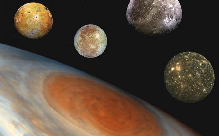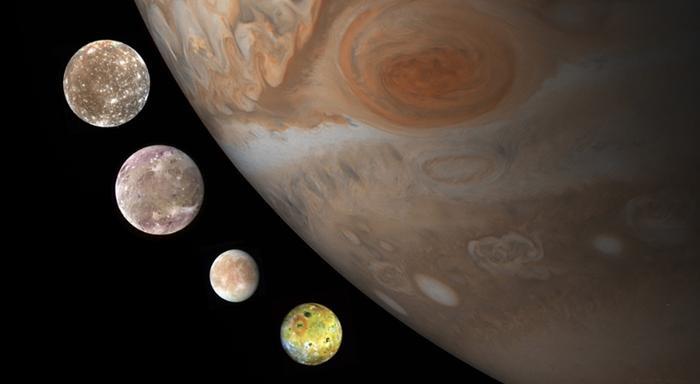木星被一个微弱的行星环系统和一个强大的磁层包围着。木星的磁尾近8亿公里(5.3天文单位;5亿英里)长,几乎覆盖了到土星轨道的整个距离。已知的木星有80颗卫星,可能更多,包括伽利略在1610年发现的四颗大卫星:木卫一、木卫二、木卫三和木卫四。木卫一和木卫二和月球差不多大;木卫四几乎和水星一样大,木卫三更大。