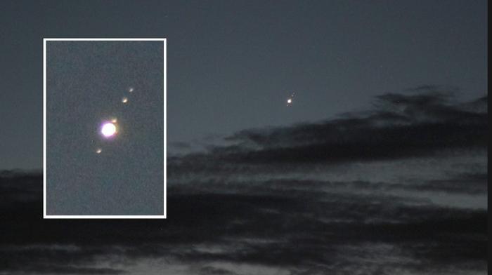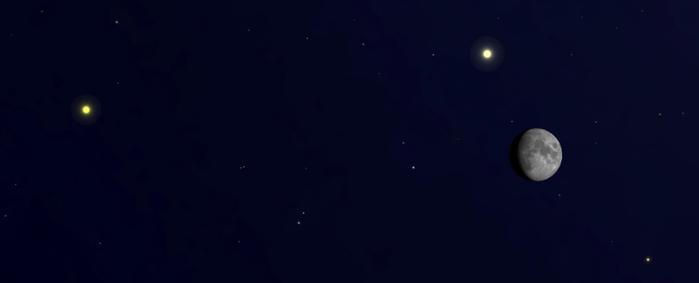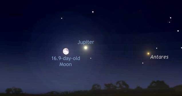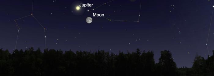 当月亮接近满月时,也就是本月的狩猎之月,它会经过木星附近。如果你朝东南方向看,你可以看到木星附近的月亮。图源John Jardine Goss/ErthSky。