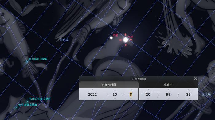 但是随着月相的复圆,盈凸月的亮度会增加,它的光芒也会逐渐盖过周围其他的恒星。木星会高挂与双鱼座小环附近,双鱼座小环是由六颗美丽但暗淡恒星组成。在10月7日,木星将会运行到水瓶座的边界附近。(海王星将会在满月的上方但由于它太黯淡了所以裸眼不可见)。在10月8日,当月球移动到木星的东侧,穿过双鱼座进入鲸鱼座时,它的亮度会随着月相的复圆进一步增加。