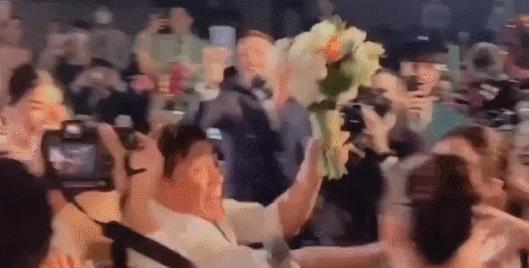 没想到该男子下一秒直接跑到女星Bow跟前,把捧花强塞给她,并拉着她的手来到新娘新郎面前。