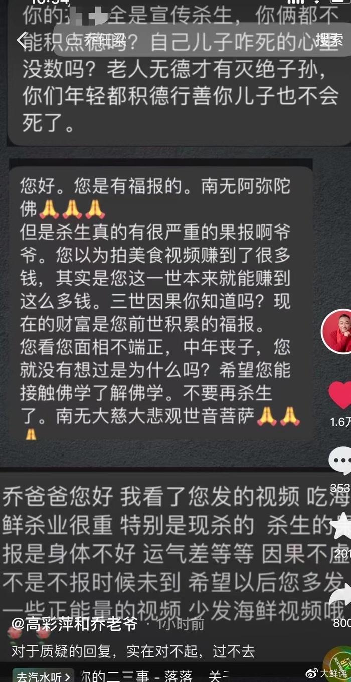 乔父气愤难忍,但依旧耐着性子解释,对于有网友说他“天天杀生才导致儿子离世”,他直言是儿子走了以后才做短视频的,而且还直指儿子就是因为你们这些网暴才死的。说这话时他眼眶微红,看起来状态不对劲。