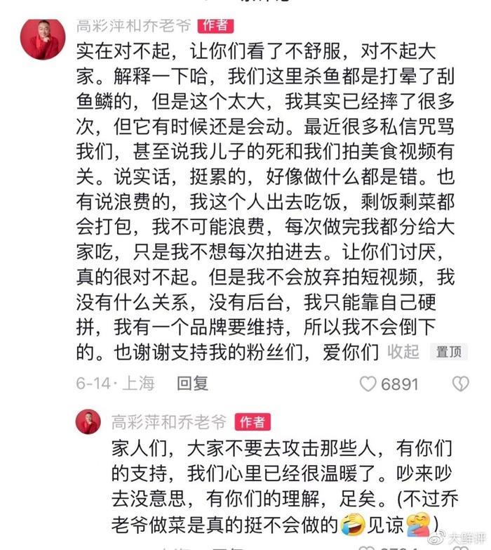 在今天的视频中,他回应了种种质疑,例如“摔鱼”是因为在菜市场看到鱼摊主都是这样处理,每次做的多也都会分给亲朋好友,并不存在所谓的浪费,更不明白怎么这些都能成为别人攻击他的理由。