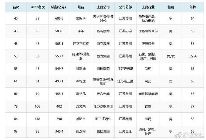 江苏富人榜第2名是56岁的李革,个人身价为583.6亿元。毕业于北京大学化学系后赴美深造,九十年代获得美国哥伦比亚大学有机化学博士学位;2023年江苏富人榜第1名是64岁的裴振华,身价达到605.8亿元。关联企业天华新能、宁德时代,天华新能的总部位于江苏苏州,企业聚焦防静电无尘产品研发、生产和销售。产品广泛应用于半导体、存储、新型显示、通讯设备、航空航天等领域。其防静电无尘服、无尘擦拭布、离子风机等产品的关键性能指标达到或优于国际知名企业同类产品。