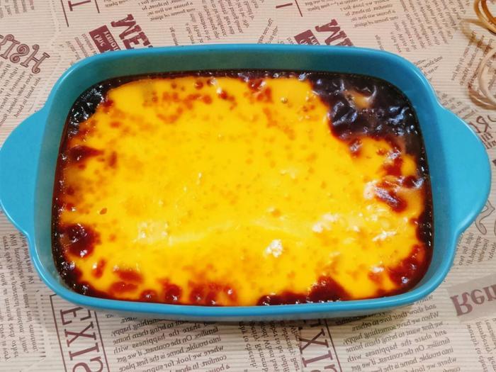 1、鸡蛋和细砂糖放入牛奶中调匀,过筛后倒入烤盘中;