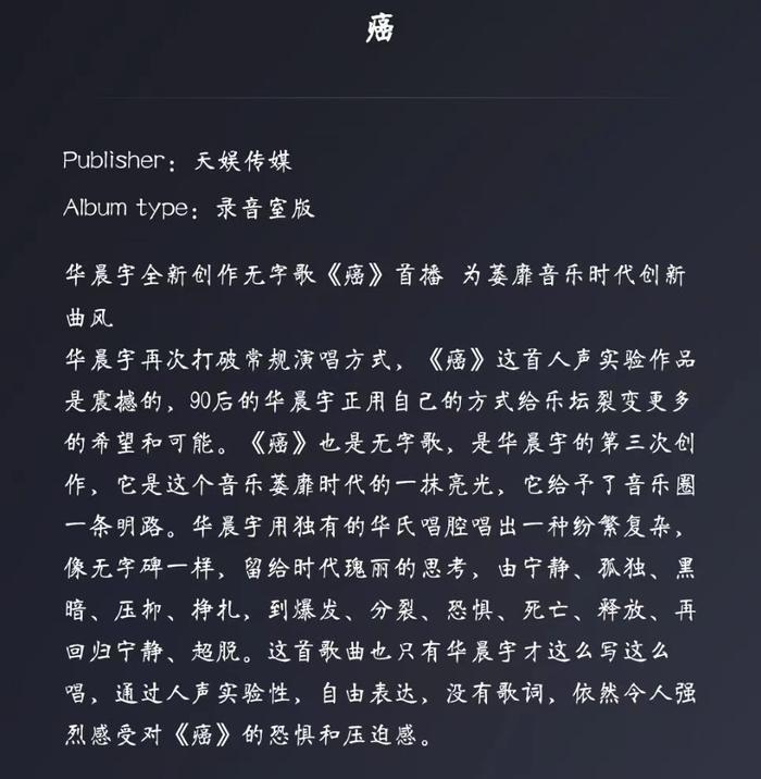 这首歌没有词,他认为旋律已经足以表达这首歌的情绪。认真听过的朋友应该能感受到,《癌》是痛苦的,可怕的,令人绝望的。因为,“癌”本身就是这样的。