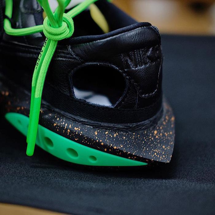 最大亮点在于它有别于一般的 Blazer,Virgil 换上了像 Air Zoom Tempo Next% 般的末端尖刺鞋底,同时在中底内侧加入支撑裁片,最后以泼墨点缀。