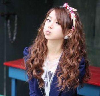 棕色的气质长卷发自然的垂落在香肩的两侧,从发顶开始烫出饱满的弧度很好的缓解了紧贴头皮的呆板感,倾斜的刘海遮盖住光洁的额头缩短了长脸的线条,展现出女孩呆萌可爱的一面。