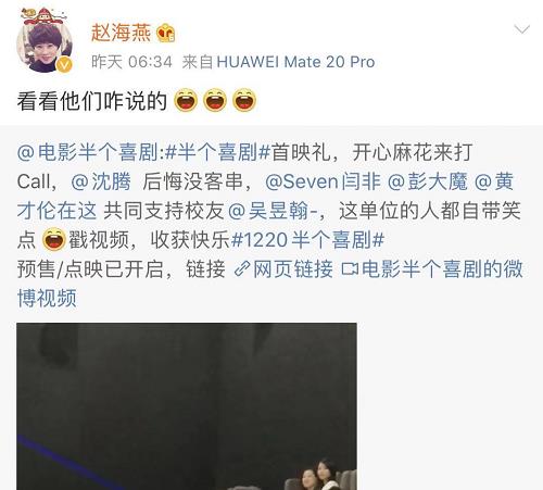 昨天也就是19号,这部电影举行了首映礼,沈腾到场观看并说:后悔没来客串,演员赵海燕也是在微博宣传自己的新电影。