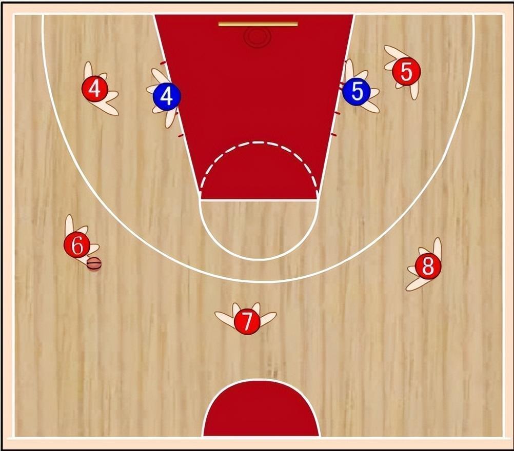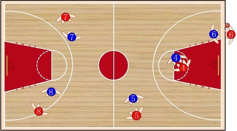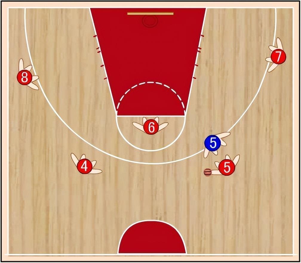 ⑤接球后迅速突破⑤,如果④前来堵截时应迅速将球传给④,由④向篮下运球突破与⑧、⑦形成以多攻少的局面。