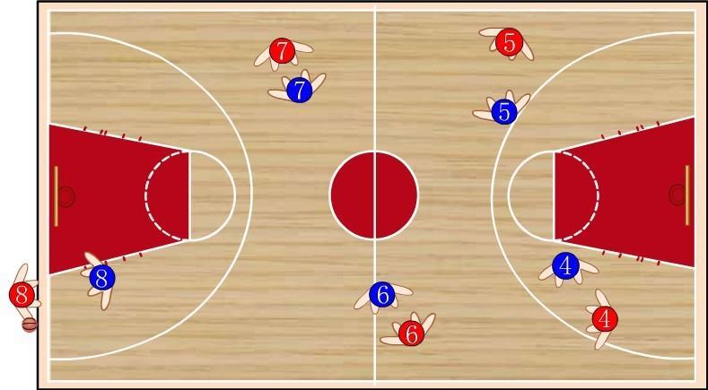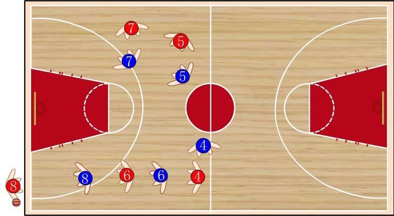 ④接球后,迅速向前场推进,⑧从异侧摆脱⑧,插到中间准备接④传球,当④看到⑧插到有利的位置时,应及时传球给⑧,⑧接球后要注意观察周围同伴的行动。⑤、④这时应快速向篮下移动,随时准备与⑧作策应配合。