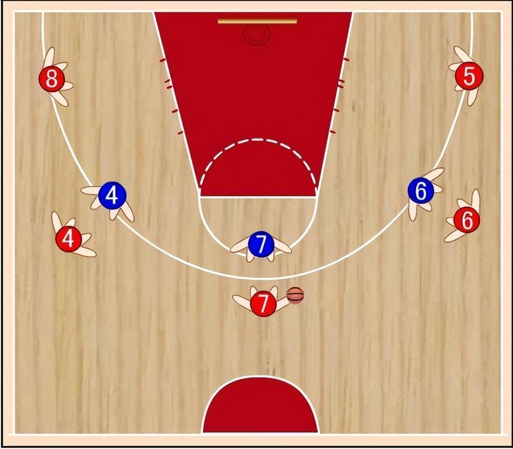 防守队员松动跟防,⑦、⑥、④运球掩护压缩场区造成中距离投篮机会,或⑧、⑤向篮下空切接同伴的传球投篮。