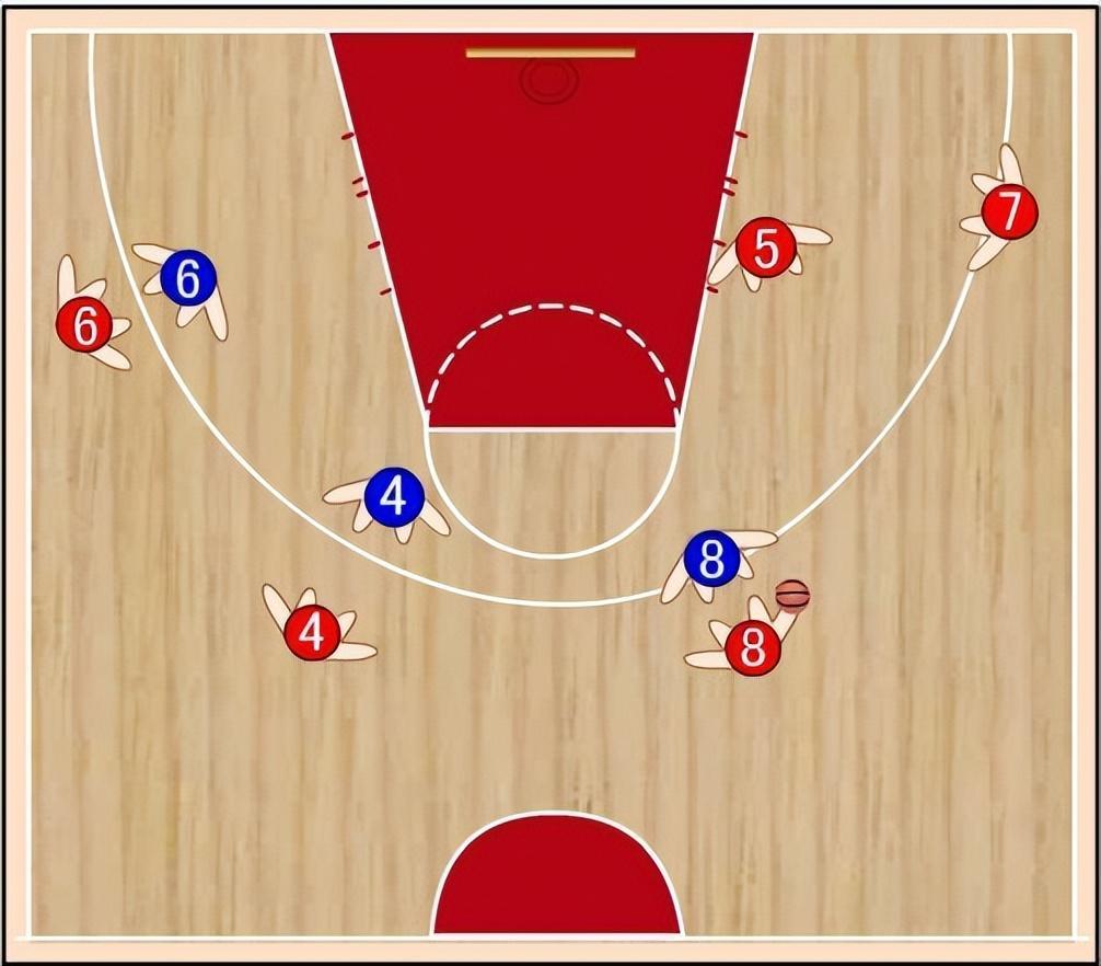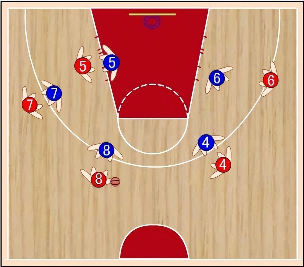⑧传球给④后传球后,⑤为⑦掩护,⑦从底线向篮下移动接④的传球投篮。