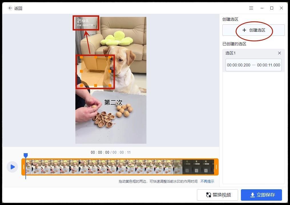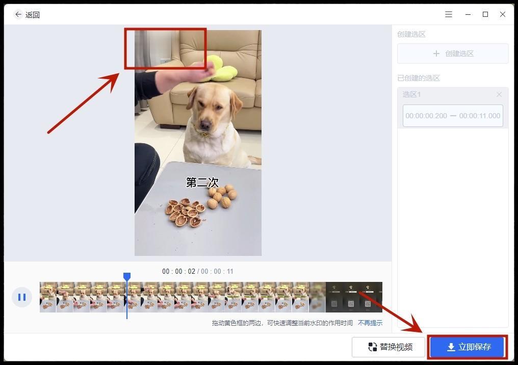 步骤四,选区覆盖上水印后,快手水印立刻消失不见了, 我们试着播放一下没有问题的话,就点【立即保存】视频然后发送到手机上就可以了。