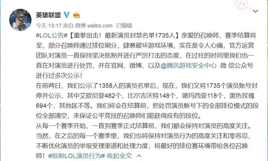 而在今天中午的时候,LOL官方也是发布声明,原来不止黑色玫瑰一个区的演员情况被制裁,电信一区等玩家数量居多的大区的导演剧组都是被横扫一空,本次处罚封停账号1735个,足足可见在腾讯出手之前的演员情况有多么的恶劣了。